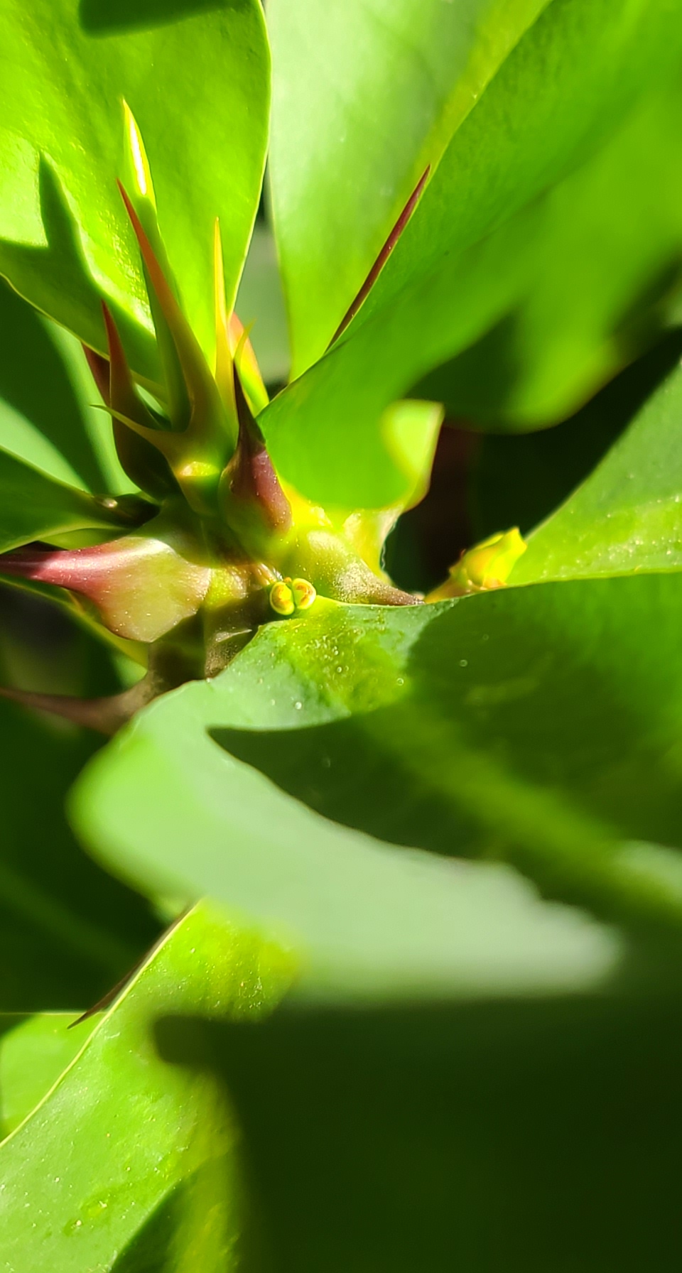 봄에 지인께서 가지치기한 거 같다 심었더니 튼실하게 잘 자라줘서 고마운 마음. 햇살 들어 자세히 살펴보니 가시도 무섭고 새순인지 꽃몽인지 알 수 없는 실체를 발견. 가시를 보니 진짜로 면류관이 떠오르기도 그래서 꽃말이 " 고난의 깊이를 간직하다 " 랍니다. 꽃기린은 가시 때문에 붙여진 이름 예수님의 가시면류관을 의미하지요. 이러한 이유로 "고난의 깊이를 간직하다"라는 꽃말을 가지고 있습니다. 꽃기린에서 우리가 꽃이라고 하는 부분은 꽃이 아닌 포입니다. 포 안의 노란 알갱이 같은 것이 꽃기린의 진짜 꽃이지요. 꽃기린의 포는 붉은색 분홍색 흰색을 띱니다. [출처] 다음 백과